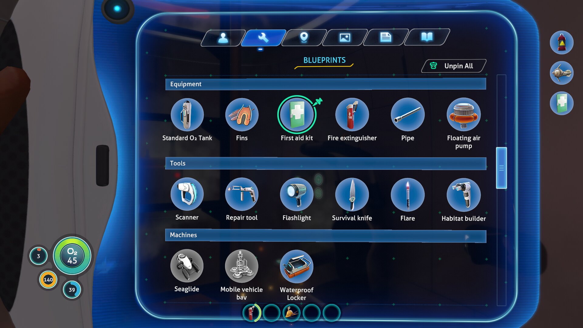 Osnovna mehanika igre je ustvarjanje predmetov iz surovin in modifikacija obstoječih. Pri tem ne rabite le ustrezne strojne opreme kot sta npr. Fabricator in postaja za nadgradnje (Modification Station), temveč tudi recepte, ki so v veliki večini neznani in jih je treba najprej odkriti. Slednjega ne morete izvesti s poskušanjem, temveč morate najti primerni vir podatkov. Recept se pogosto odklene ob najdbi določene surovine ali načrta (Blueprint), kar nekaj pa se jih omogoči ob preiskavi zadostnega števila delčkov predmeta (Fragments). Drugi pomembni del igre je ustvaritev primerne baze, ki je lahko tako podvodna kot tudi kopenska, da v njej shranjujete nabrane materiale in jih predelujete ter si seveda odpočijete po dolgotrajnem raziskovanju. Elemente baze ustvarjate s posebnim ročnim orodjem imenovanim gradnik habitata (Habitat Builder), pri gradnji pa niste omejeni, le primerno boste morali ojačati stene, če boste želeli graščino v globinah. Za nemoteno delovanje boste morali poskrbeti tudi za elektriko (sončne celice, toplotni reaktor, itd.), ki omogoča tudi oskrbo s kisikom, potem pa vam ostanejo samo še nadgradnje in izboljšave, vmes pa se lahko posvetite raziskovanju.